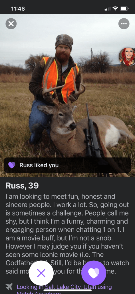 Dead animals are not as sexy as boys seem to think. Furthermore, I will never swipe right on: